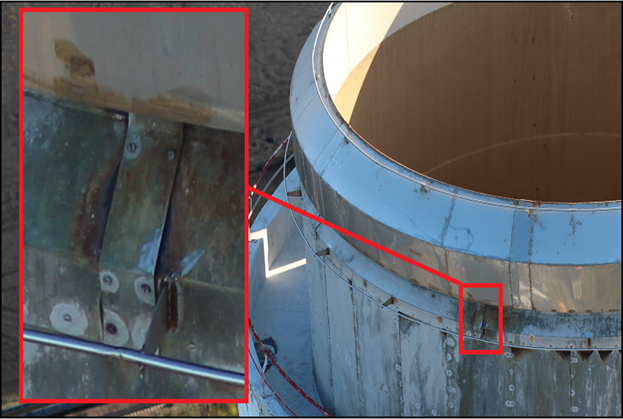 Droneinspektion af skorsten afslører områder med korrosion og revner i betonen.