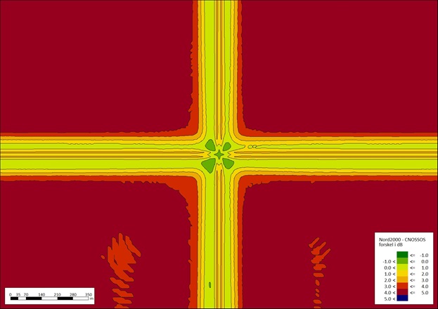 Med Nord2000 er der ikke foretaget nogen ændringer i hastigheden, og der er ikke antaget accelerationer, mens der med CNOSSOS er korrigeret for lyskrydset. Positive værdier (røde områder) betyder, at Nord2000 beregner højere værdier end CNOSSOS. Negative værdier (mere mørkegrønne områder) betyder, at CNOSSOS giver højere værdier. De store røde områder i figur 3 er forskelle, der generelt ses for vejstøjberegninger, hvor CNOSSOS typisk beregner mindre støj end Nord2000.