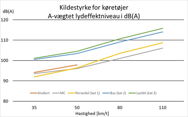 Motorcykler udgør bestandsmæssigt ca. 6 % af det samlede antal personbiler, og knallert 45 udgør ca. 1 %. Hvis man skønsmæssigt antager, at motorcykler og knallert 45 har samme kildestyrke som personbiler, vil en andel på 1 % betyde, at støjbidraget herfra er 20 dB lavere end bilernes bidrag, og 6 % vil betyde 12 dB lavere støjbidrag end fra personbilerne.