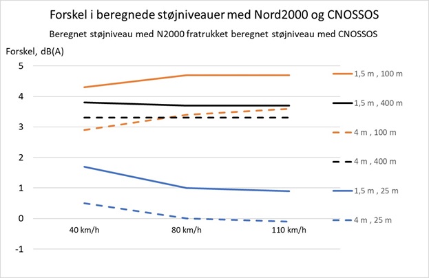 Forskelle i beregningsmetoderne CNOSSOS og Nord2000 vil betyde, at resultaterne giver lavere støjniveauer beregnet med CNOSSOS end med Nord2000. Forskellene er størst i længere afstande fra kilden – og særligt ved kuperet terræn, skærmning og/eller skærmende og reflekterende bygninger.