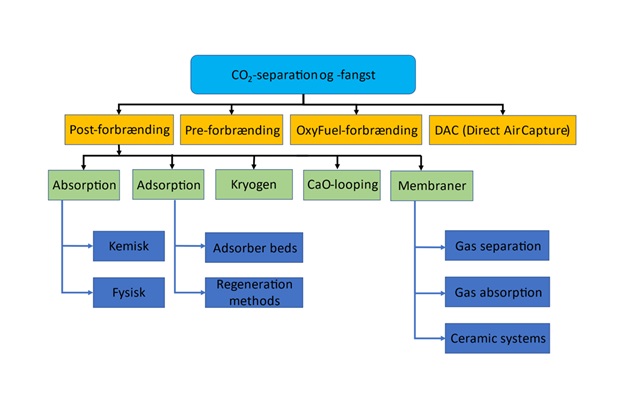 Der findes en lang række teknologier til CO2-fangst, og de har alle hver deres styrker i forskellige anvendelsesområder. En oversigt over et udvalg af teknologier er præsenteret i Figur 1 herunder.