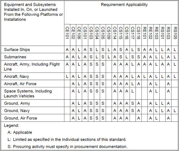 Lov aldrig at overholde ”hele MIL-STD-461”. Uden begrænsninger vil det medføre, at der skal overholdes både EMP-test, lyntransienttest og HF-indstrålingstest med 200 V/m. Også på emissionssiden kan kravene være svære at overholde. Som udgangspunkt kan udstyrsklassen ”Ground, Army” benyttes, hvis ikke kunden allerede har fastlagt sine forventninger. De pågældende tests ses i skemaet Figur 1, hvor Ground, Army har 8 stk. ”A”, der er Applicable Tests.