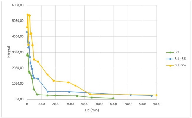 Undersøgelsen er udført for at evaluere metoden, og vurdere hvordan et overskud og et underskud af hærder (±5 %) påvirker hærdehastigheden samt udhærdningsgraden. Det er vigtigt at huske på, at dette kun er et modelsystem der kan vise trends, da der ved analyserne bruges meget små prøvemængder på 10-15 mg. For at evaluere effekten af prøvestørrelsen, blev der desuden udført en DSC test på et emne på ca. 200 g, både fra emnets centrum og emnets yderside.