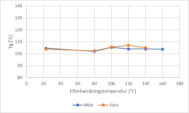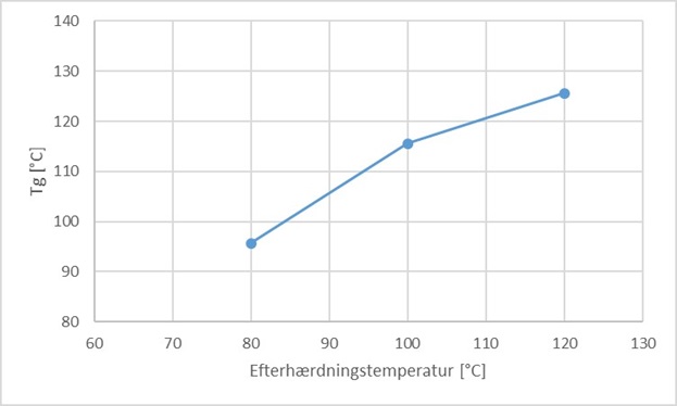 Til vurdering af Tg som funktion af efterhærdningstemperaturen, er prøverne efterhærdet i 2 timer ved hhv. 80, 100 og 120 °C efter støbning. Producenten anbefaler en efterhærdningstemperatur på 120 °C i 2 timer, og oplyser i databladet, at der ved denne efterhærdningstemperatur opnås et Tg på ca. 105 °C.