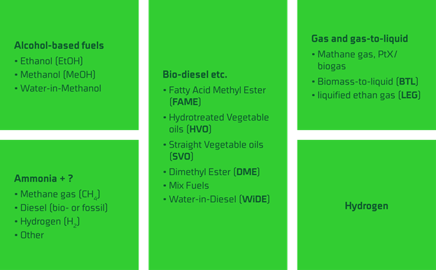 De nye typer brændsler skal tilpasses de enkelte branchers behov. For eksempel forventes ammoniak primært at blive anvendt til forbrændingsmotorer på det maritime område. Det samme gælder brændsler, der iblandes vand. Derimod er HVO (Hydrotreated Vegetable Oils) et eksempel på en biodiesel, der i højere grad retter sig mod vejgående trafik.