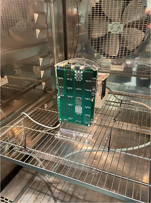 De fire printkort blev testet parvis ved to forskellige konditioner: 25 °C / >90 %rh (5 uger) og 65 °C / >90 %rh (fire uger).