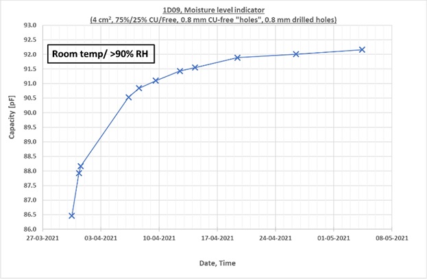 Kurven i fig. 3 viser resultaterne for den bedste MLI, som er 4 cm2 og har et kobber/frihul-forhold på 75 % / 25 % (196 stk. 0,8 mm huller). Resultaterne bekræfter, at man kan opnå målelige ændringer i kapaciteten indenfor få timer. Den totale kapacitetsændring er, som forventet, ca. 7 %. De mange resultater viser også, at man kan optimere MLI’en på responstid til nogle applikationer og kapacitetsændring (følsomhed) til andre. Derudover vil man, med passende måleelektronik, kunne detektere og alarmere om kondensnedslag.