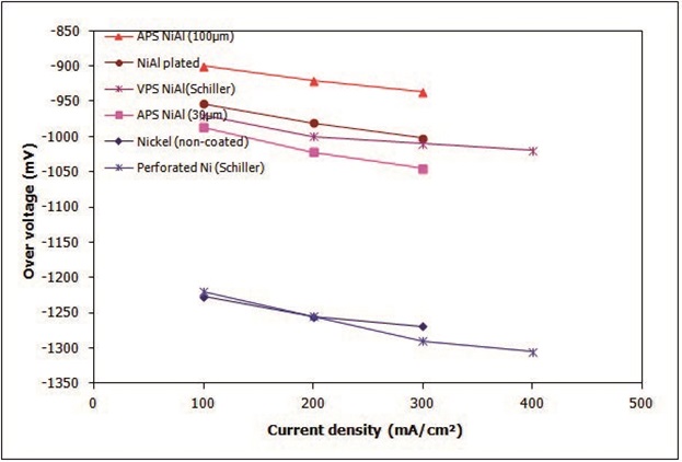 Den elektrokemiske ydeevne blev sammenlignet med ikke-belagt nikkel, og NiAl-belægningerne gav straks en betydelig forbedring (dvs. reduktion) af cellespændingen, selv ved en lille belægningstykkelse på 30 µm. En lang række belægninger produceret af APS er blevet testet på denne måde. Den bedste ydeevne ses for en belægning med en tykkelse på 100 µm, som det ses nedenfor. Der blev ikke observeret nogen yderligere forbedring ved at øge belægningstykkelsen yderligere til fx 300 µm.