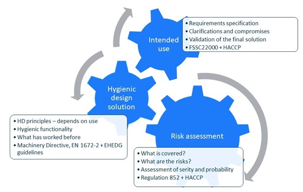 Derfor er det afgørende, at processen med at stille krav (Tiltænkt anvendelse), finde løsninger (Hygiejnisk design løsning) og foretage en relevant vurdering af risici (Risikoanalyse) i et vist omfang er en iterativ proces.