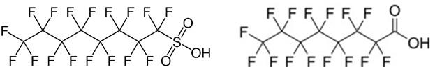 PFAS består grundlæggende af et kulstofskelet af varierende længde og kompleksitet. Kulstofskelettets brintatomer er helt eller delvist udskiftet med fluor. Derudover kan der være en eller flere funktionelle grupper forbundet til kulstofskelettet, fx en karboxylsyre-, alkohol- eller sulfonsyregruppe. To af de mest almindelige PFAS, perfluoroctansulfonsyre (PFOS) og perfluoroctansyre (PFOA) er vist herunder på Figur 2.