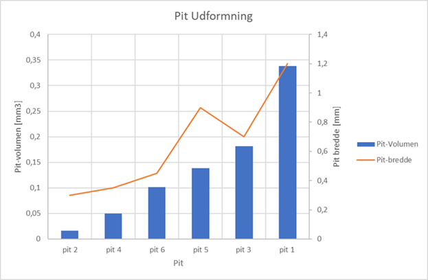 I figur 4 ses resultatet af volumenbestemmelse ved 3D mikroskopi-undersøgelsen, hvor pit-volumen aflæses i histogrammet og fordeler sig mellem 0,03–0,34 mm3 - en fordeling, der giver god basis for at bestemme korrelationen mellem udblødning af volumen.
