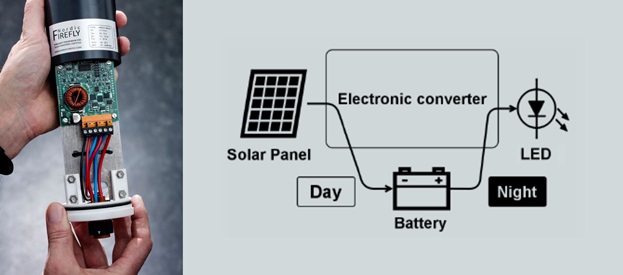 Konverteren konverterer effekt fra solpanelet til batteriet om dagen og fra batteriet til LED lampen om natten, så den er i operationel brug 24/7, når den er installeret i masten.