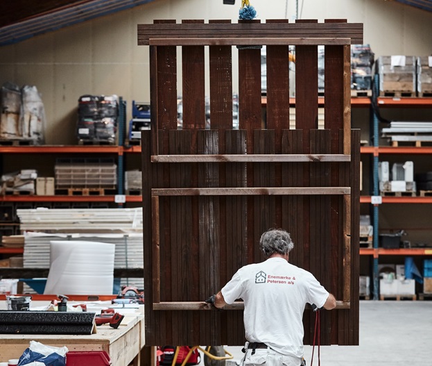 På Enemærke & Petersens byggefabrik produceres præfabrikerede elementer så som tag- og vægelementer (ses i artiklens øverste billede).
