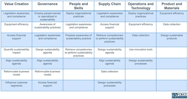 Spørgsmålene i Factory Sustainability Assessment gik på seks forskellige dimensioner, som ses nedenfor: