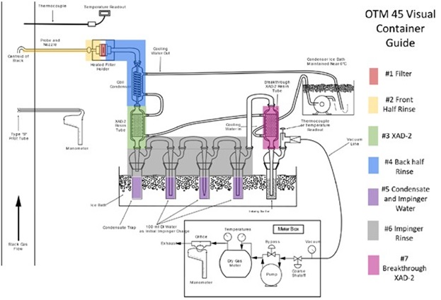 OTM-45 in many ways resembles the method currently used for measuring dioxins, PCBs, and other micro-pollutants in flue gas, but with additional collection steps.