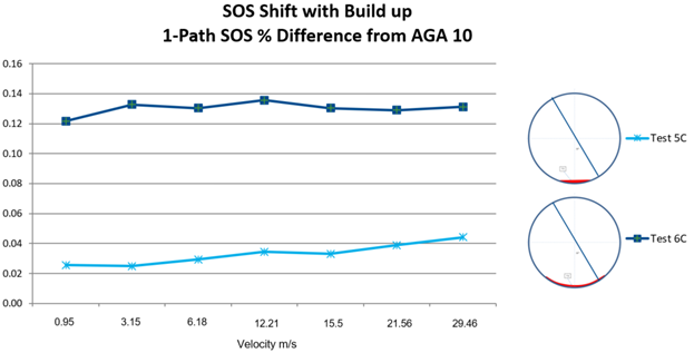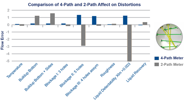 For example, reflective and direct path meters show opposite flow error biases, helping to detect process disturbances early. In contrast, liquid or buildup contamination requires the comparison of speed of sound (SOS) between different meter types and paths to identify issues.