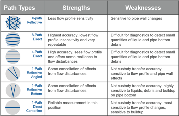 For instance, both orifice meters and ultrasonic meters can overread in the presence of liquid or buildup. If two ultrasonic meters share similar path configurations, common mode error can still occur. To address this, combining different path types (direct and reflective) in a meter can enhance diagnostics and reduce the risk of common mode error. Reflective paths are sensitive to pipe wall effects and can detect issues like buildup or contamination early.