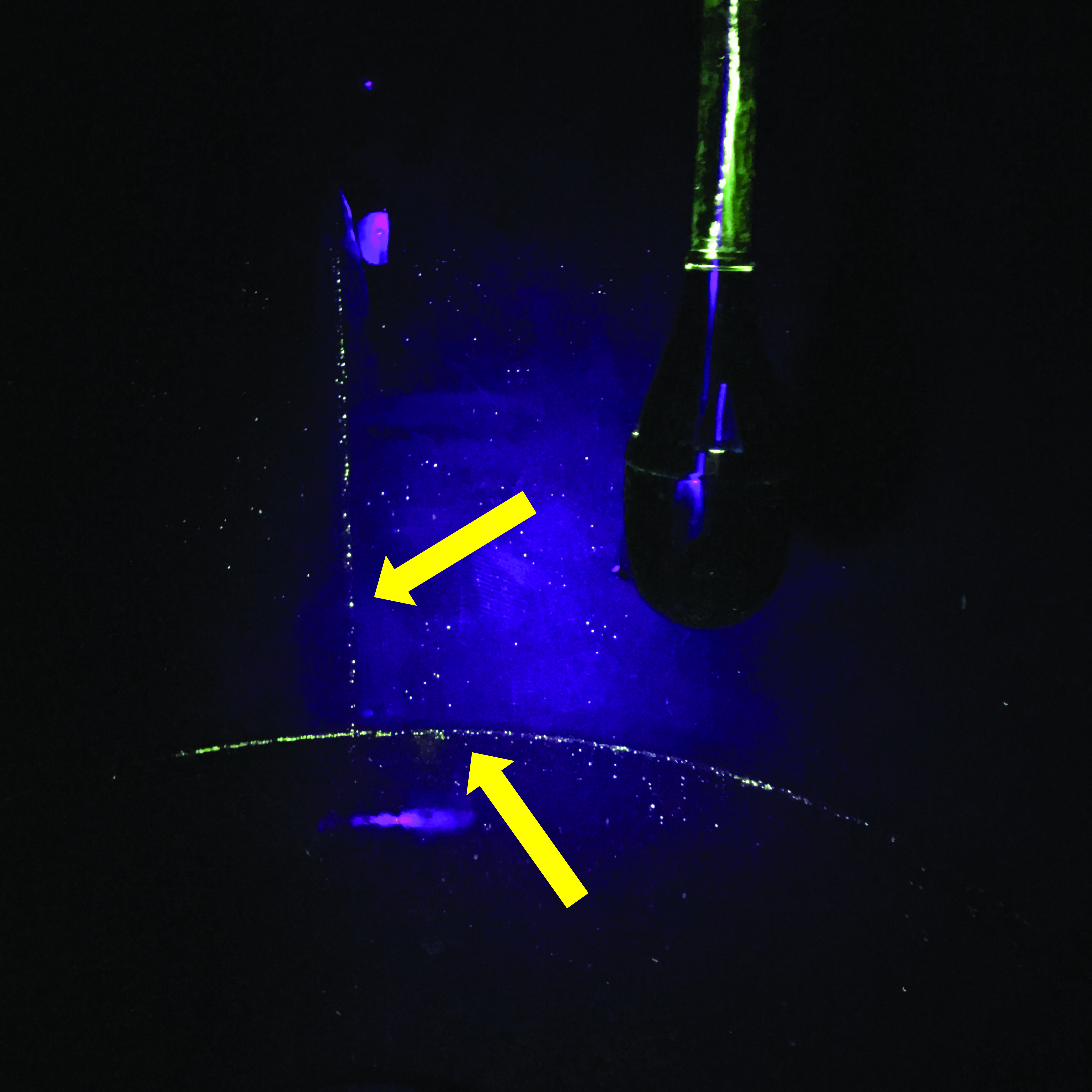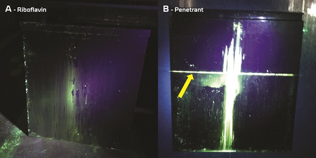 An alternative fluorescent penetrant (FP-10, Magnaflux) was tested instead of riboflavin. Penetrant is known and used in penetrant testing—an NDT (non-destructive testing) method used to detect microscopic cracks and crevices open to the surface. The penetrant adheres well to metal surfaces and penetrates cracks and other openings via capillary action. By combining the penetrant with a developer, you can locate defects in surfaces not visible to the naked eye.