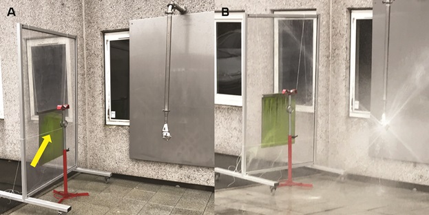 In a series of experiments, 1x1 m metal plates were covered with either riboflavin or penetrant. The plates were then hung up for cleaning by a CIP nozzle for 2 minutes. To simulate a blind cleaning angle, a pipe was placed in front of the plate, casting a shadow on the water jet from the CIP nozzle (see Figure 1). After washing, the plates were illuminated with a UV source to detect any remaining riboflavin or penetrant, revealing the blind cleaning angle.