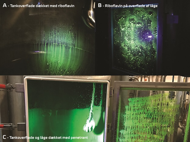 This has been the starting point for a series of experiments conducted by FORCE Technology in collaboration with Alfa Laval at Alfa Laval's pilot plant. Here, the effectiveness of cleaning has been examined using both riboflavin and an alternative fluorescent test fluid on metal plates, pipes, and in a tank.