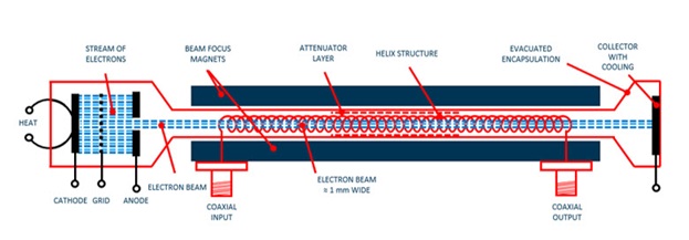 If you need to go above 6 GHz, the amplifiers often have a built-in TWT (Travelling Wave Tube). The TWT can be described as an experimental, physical structure installed in an amplifier cabinet. The principle is shown in Figure 3 and consists of transferring the energy from a powerful electron beam to the same frequency as the HF signal, which is coupled to the TWT’s input.