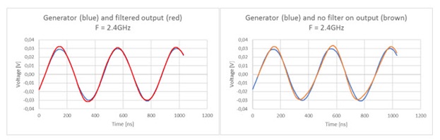 Besides the price and complexity, the amplifiers are difficult because they generate a pretty coarse signal, which combined with the desired signal includes some noise and harmonic overtones. An example of this is shown in Figure 4, where A shows the input and output signal on a 2-8 GHz TWT amplifier of 250 W. With the use of the output filter, input- and output signals remain reasonably the same, with a satisfactory signal. Without the filter (B) the signal becomes more distorted. There are differences in the positive and negative half period, which shows the content of equal harmonic overtones in the signal. It can impact EMC test results if the distortion becomes so powerful that the amplifier is almost testing several frequencies at the same time.