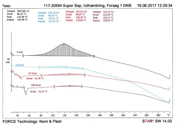 As model system, a commercial SUPER SAP INR 2-component epoxy system has been chosen, which can be applied to the manufacture of composite products for vacuum infusion and RTM. Initially the epoxy system is cured at 23 °C and subsequently post-cured at various temperatures. The degree and rate of curing the SUPER SAP INR SYSTEM is investigated using DSC. A typical DSC thermogram, which is used to assess the degrees and rates of curing, is shown in Figure 1. When curing, epoxy gives off heat, this called an exothermic reaction (as opposed to an endothermic reaction, where heat is absorbed).