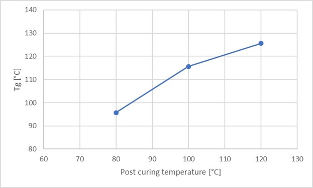 For the assessment of Tg as a function of the post-curing temperature, the test samples were post-cured for 2 hours at 80, 100 and 120 °C respectively after casting. The manufacturer recommends a post-curing temperature of 120 °C for 2 hours, and states in the data sheet that at this post-curing temperature, a Tg of approx. 105 °C is obtained. Figure 3 shows Tg as a function of the post-curing temperature for a test sample of 10-15 mg. It is observed that the Tg increases at a higher post-curing temperature.