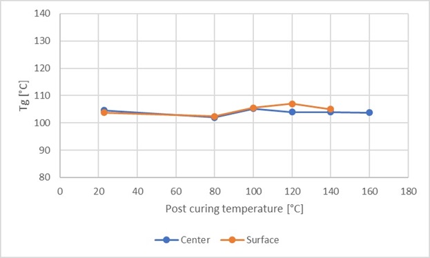 Figure 4 shows Tg as a function of the post-curing temperature for a test sample of 200 g, where both the surface and the centre have been evaluated. The same effect is not observed with small test sample amounts as with large test sample amounts, which is presumably due to the difference in the reaction in small and large samples, primarily differences in temperature due to the low thermal conductivity of the resin.