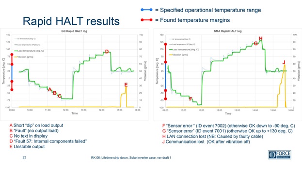 Figure 3 shows a condensed summary of the two rapid HALT tests in the form of logarithmic graphs with annotations. The heavy blue stroke on the Y axis indicates the product's specified temperature range, while the heavy red stroke shows temperature margins. The graphs clearly show that the expensive solar cell inverter (from SMA) has wider margins than the cheap one (from GC).