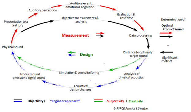 Optimising product sounds is often an iterative process, as illustrated in Figure 1. The process starts with the product's physical sounds (to the left), possibly in several versions. The sounds are rated by a panel of listeners (uppermost red path), and the results show the characteristics that are preferred or most appropriate for the product. Physical measurements of sound characteristics may be taken simultaneously (the black path).