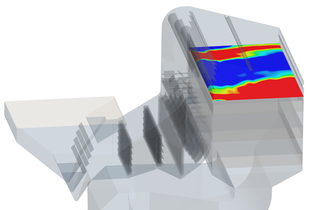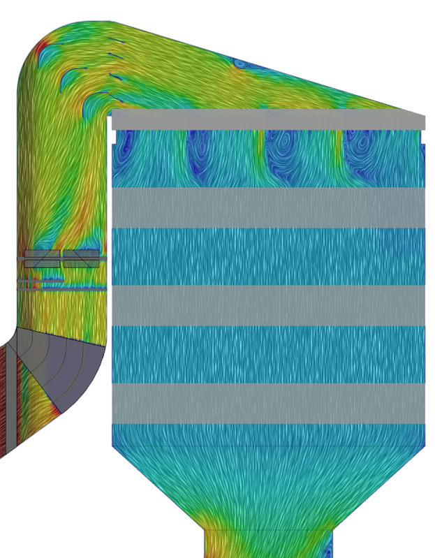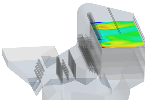 CFD and EFD were used to analyse the SCR unit at a Chinese coal-fired power plant, where NOx emissions remained high despite the installed reduction system. The analysis identified flow distribution issues and enabled optimisation of the unit design.