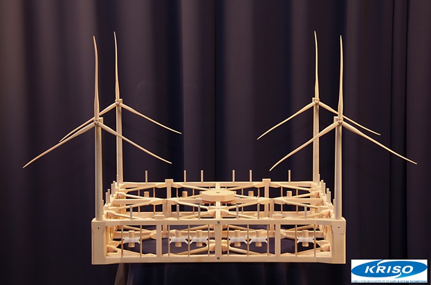 The square floating platform will be equipped with four offshore wind turbines - one in each corner - and wave energy converter (WEC) buoys along the sides. The WEC buoys move vertically along the waves to absorb the energy, thereby producing electrical power from the movements of the waves. Thereby the platform becomes a power generation system for energy produced from both wind and wave.